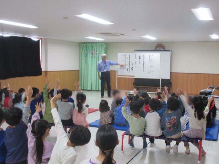 相模原市交通地域安全課の方に交通安全についてのお話をしていただき、園庭で横断歩道の渡り方を確認しました。