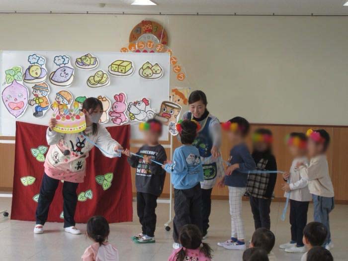 「お弁当バス」の絵本シアターを楽しみました。お誕生日のお友だちがバスに乗ってホールをまわりました。
