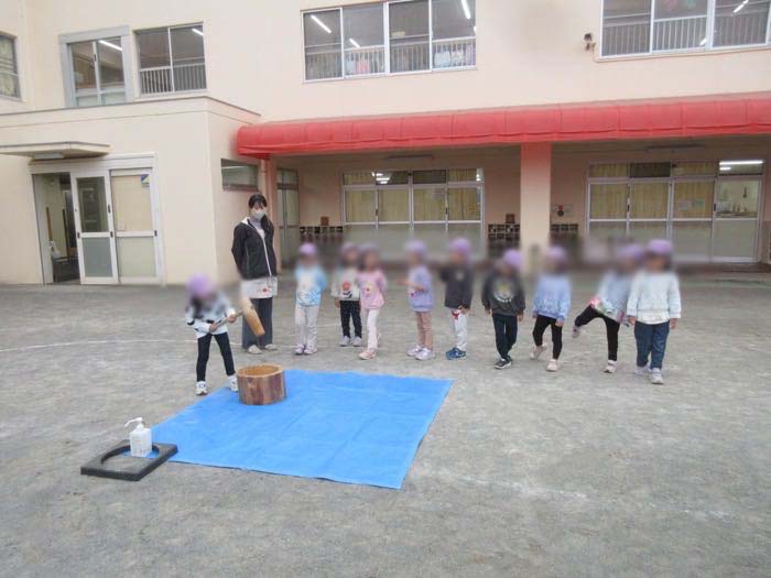 乳児クラスと3歳児クラスは先生と、4・5歳児クラスはひとりでお餅をつきました。