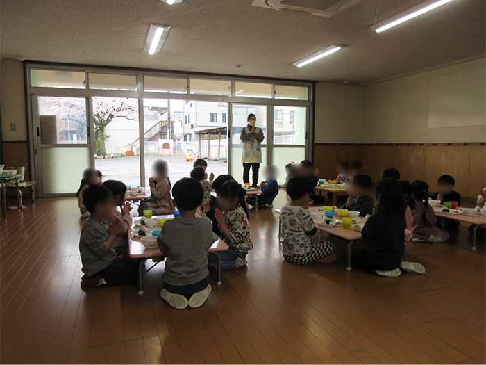 あいにくのお天気でしたが、お部屋から園庭のきれいな桜を見ながら、楽しい給食の時間となりました。