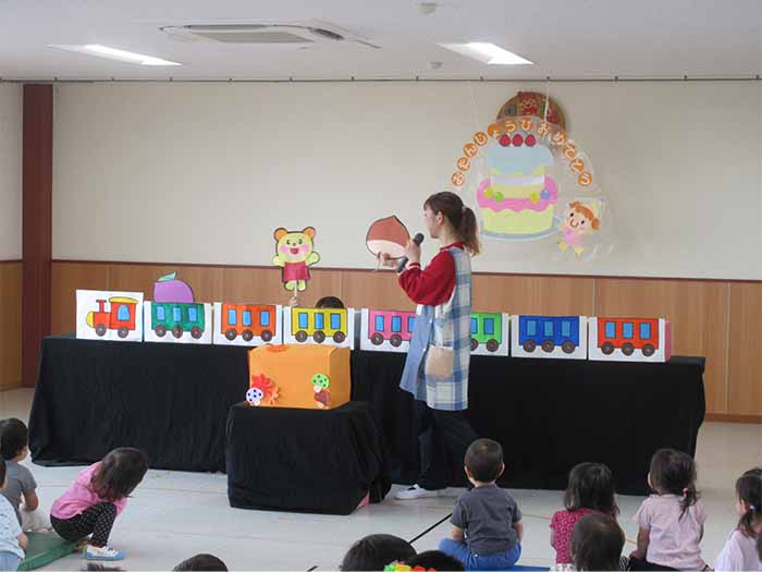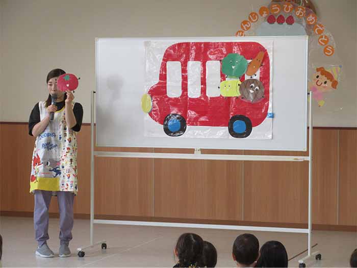 「お弁当バス」の絵本シアターを楽しみました。お誕生日のお友だちがバスに乗ってホールをまわりました。