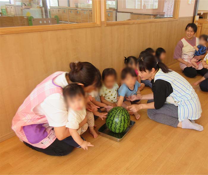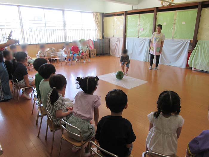 乳児クラスは大きなすいかに触れ、幼児クラスはすいかわりをしました。みんなで美味しくスイカをいただきました。