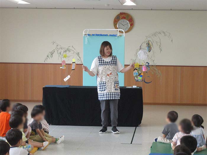 クラスで作った七夕飾りを発表しました。七夕のお話の後、七夕クイズも楽しみました。