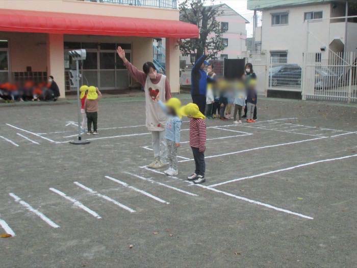 相模原市交通地域安全課の方に交通安全についてのお話をしていただき、園庭で横断歩道の渡り方を確認しました。