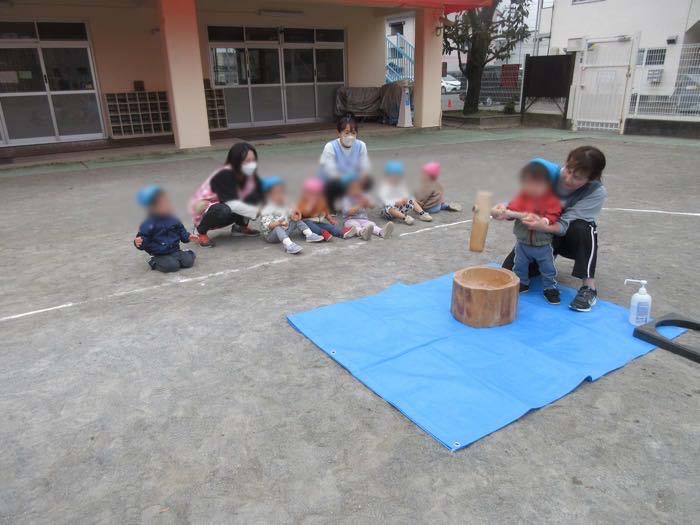 乳児クラスと3歳児クラスは先生と、4・5歳児クラスはひとりでお餅をつきました。